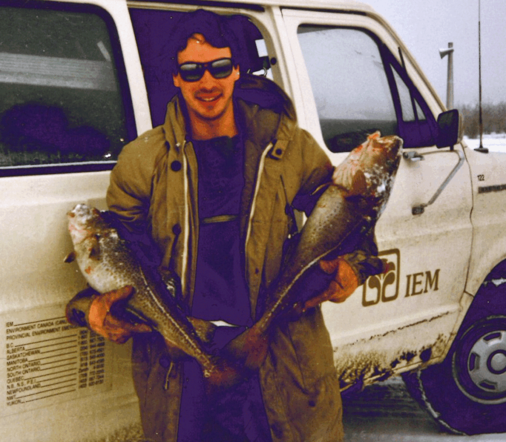 L’auteur avec ses premières morues franches capturées à la pêche blanche dans le Saguenay dans les années 80.